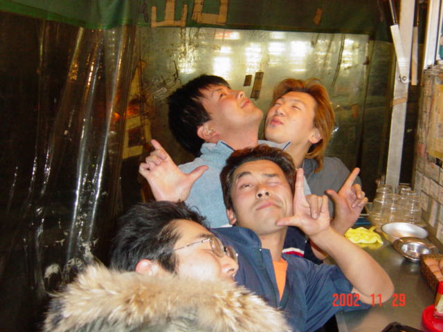 また見つけた!!!!22歳の時の飲んだ暮れの日々の写真!!!!ぶっはっはっはっはっは!!懐かしい!!今でも馬鹿をやりあえる愉快な仲間達ですよ。一番手前が山ちゃん。次、りょ〜君。んでちょっと危ない関係のこ〜ちゃんとオイラ。これ多分飲んで飲んで腹が減ったぁぁぁ!!!って誰かが訴えて行ったあざみ野に有った屋台の熊本ラーメン屋さんですね…。今ではなくなってしまって淋しい感じがしますよ。若かったなぁ〜。ぶはははは!!変なのがいるぅぅ!!