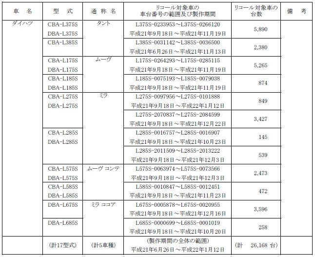 ダイハツ工業株式会社より タント・ムーヴ・ミラ・ムーヴコンテ・ミラココアに リコールが出ております