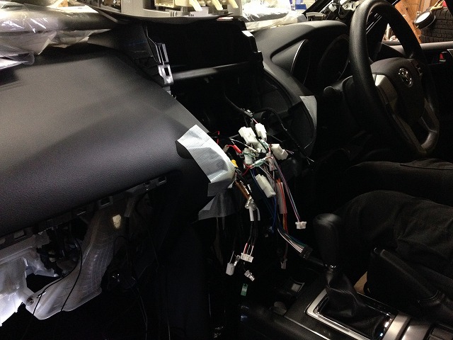 工場の鈴木です本日はランクルの新車仮装ですエアロとアルミをつけてオーディオレス車にナビとリヤモニターとETCとカメラを付けましたグローブBOXの中にETCを付けますここです天井を切り取ってモニターを付けますアンテナ付けて各配線を繋げて準備したらここでシンプルに束ねてデッキを付けていきますシンプルにしておかないとデッキの裏で配線がかんだり入らなくなります取り付けたら作動確認します今回ナビとバックカメラはイクリプスリヤモニターはアルパインを使用しました