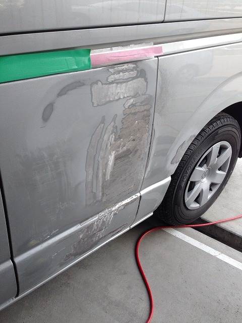 221ハイエース鈑金修理作業中です。左側面の修理です。通常のハイエースに比べてまた大きなハイエースですからね・・・前回、保険修理での交換作業を行っておりますが、今回は実費の鈑金修理で直します。鉄板が何気に入り込んでいるのと、面積が広いので、引っ張り出すのに苦労してました横から後ろに掛けてキズがあるので側面は一緒に直します。下地作業を馬絹の工場で終わらせて会社の前にある塗装ブースへ運び込みました。マスキングを施して塗り始めて行きます。明日には全て終わらせて水曜日にお戻しさせていただく予定です。レストガレージ 阿部