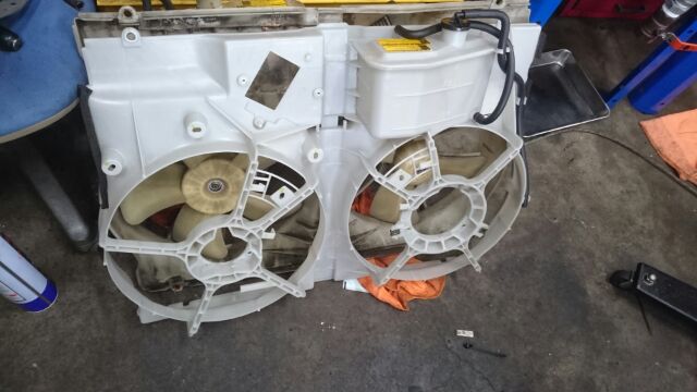 工場の森です本日はトヨタ アルファードの車検整備を行いました距離が10万キロ超えていたのでタイミングベルト交換ウォーターポンプ交換今は漏れていませんでしたが漏れた痕はあったので今回交換しておいて良かったですサーモスタッド交換そして今回の目玉ファンシュラウド交換なんで交換するかというとサブタンクのつなぎ目が割れて漏れてしまっていましたこのタイプのサブタンクはファンシュラウドと一体型なのでこんな感じの部品が届きます交換してエア抜きをして作業終了です
