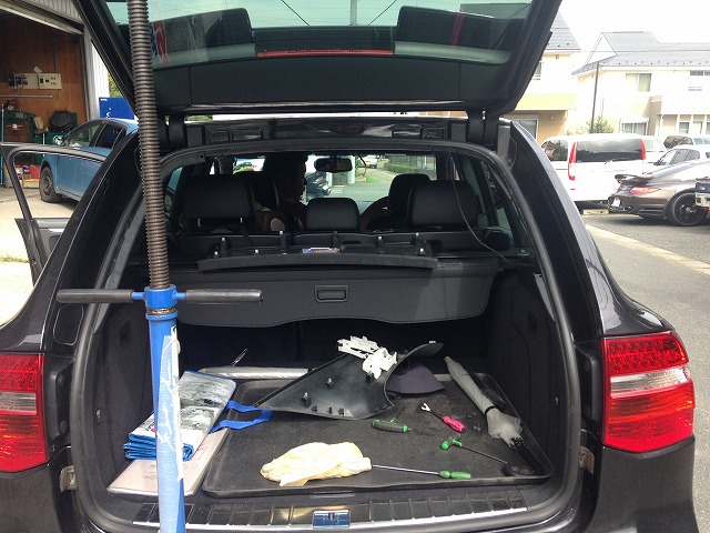 工場の鈴木です本日はカイエンのリヤゲートダンパー交換です抜けるとリヤゲートはかなり重いです作業はYAZAWAを使って行いますYAZAWAはつっかえ棒で永吉さんのマイクスタンドに似ているのでYAZAWAと呼ばれてます屋根の中に付いてますくいくいっと外します新品をぱちぱちっとはめれば完成です簡単そうですが内装を外すので傷など付かないように作業しています交換後、気持ちよくゲートが開閉できました