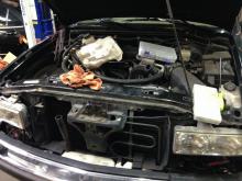 工場の鈴木です本日はブレイザーのエアコンが効かない修理ですコンデンサーの左下部分からガス漏れしていました外れた状態の写真を上にのせましたがクーリングファンとラジエターを外さないとコンデンサーが外せないので手間がかかりました組み込み後真空引・・・